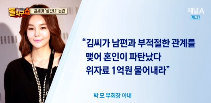그런 루머가 퍼지며 부회장의 아내는 이런 사실을 알게 된 후 이혼을 요구하며 큰 이슈가 되기도 했었는데요. 동시에 김세아를 상간녀로 지목, 1억 원 상당의 위자료 청구소송도 함께 제기했던 사건이죠.