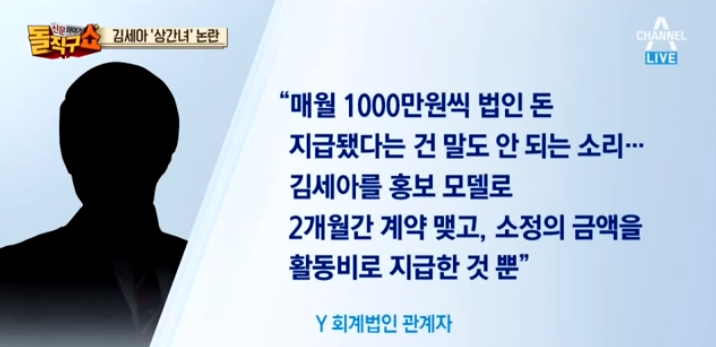 김세아와 용역계약을 맺어 매 월 500만 원을 법인 비용으로 지급했다는 루머도 나왔었으며 김세아가 타고 다녔던 토요타 차량도 해당법인 소유였다는 등의 기사가 나오기도 했었죠.