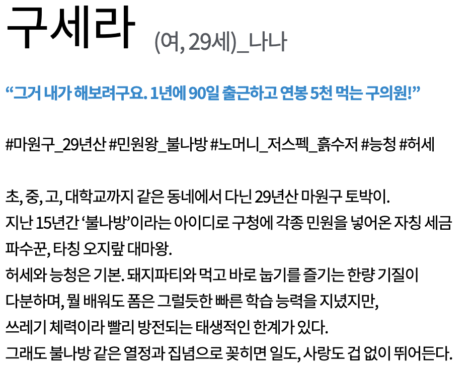 극중에 나나는 초, 중, 고, 대학교까지 29년동안 같은 동네 마원구 토박이 취준생인 구세라를 연기합니다. 출사표는 엘리트 사무관 서공명이 불량 정치인들을 응징하는 오피스 로맨스 코미디 드라마입니다.